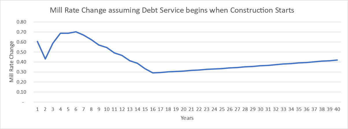 Sharon sells $12.5 million of 40-year bonds at 2.5% interest rate, amortizing the debt over 40 years. No increase in $89/month household subscription fee for 40 years. No growth in the Grand List for 40 years. Operating expenses flat in years 1-5 and then rise at 1% each year for years 6-40. Percentage of homes subscribing (“take rate”) assumed: 0% - year one; 10% - year two (midway through construction); 20% - year three (construction ends at the end of this period); 22% - year four; 25% - year five; 28% - year six; 30% - year seven; 33% - year eight; 35% - year nine; 38% - year 10; 40% - year 11; 43% - year 12; 45% - year 13; stays level at 45% for remainder of 40-year period.