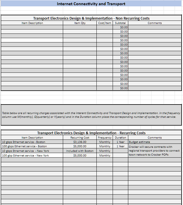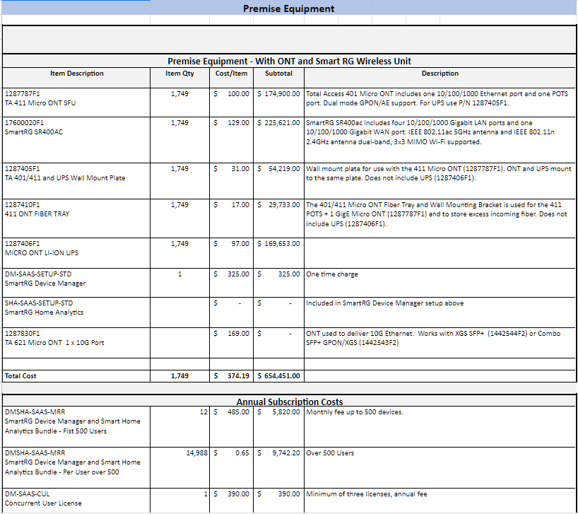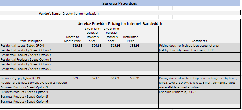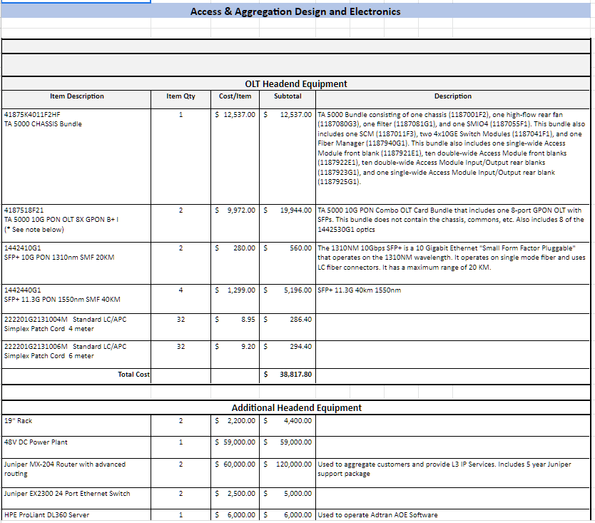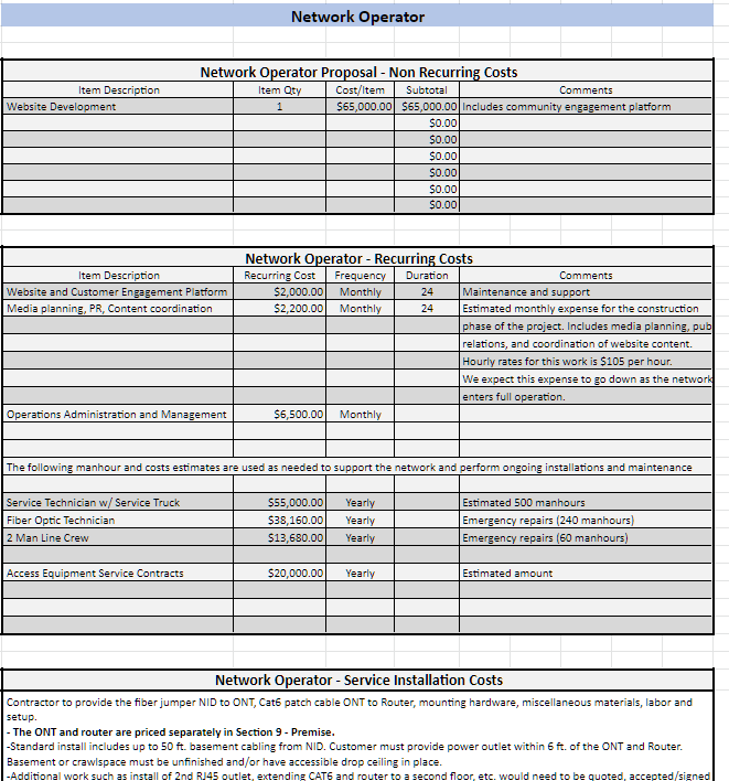 You can review Sertex Broadband Solutions’ financial overview by clicking on the image to the left. The first page summarizes the major costs and scale of the project. Note that there are several spreadsheets nested in this workbook. For even more granular details, click on each thumbnail image in the panel below. These cost projections are not yet fixed and could change depending on design decisions that would be made if the network is actually constructed.